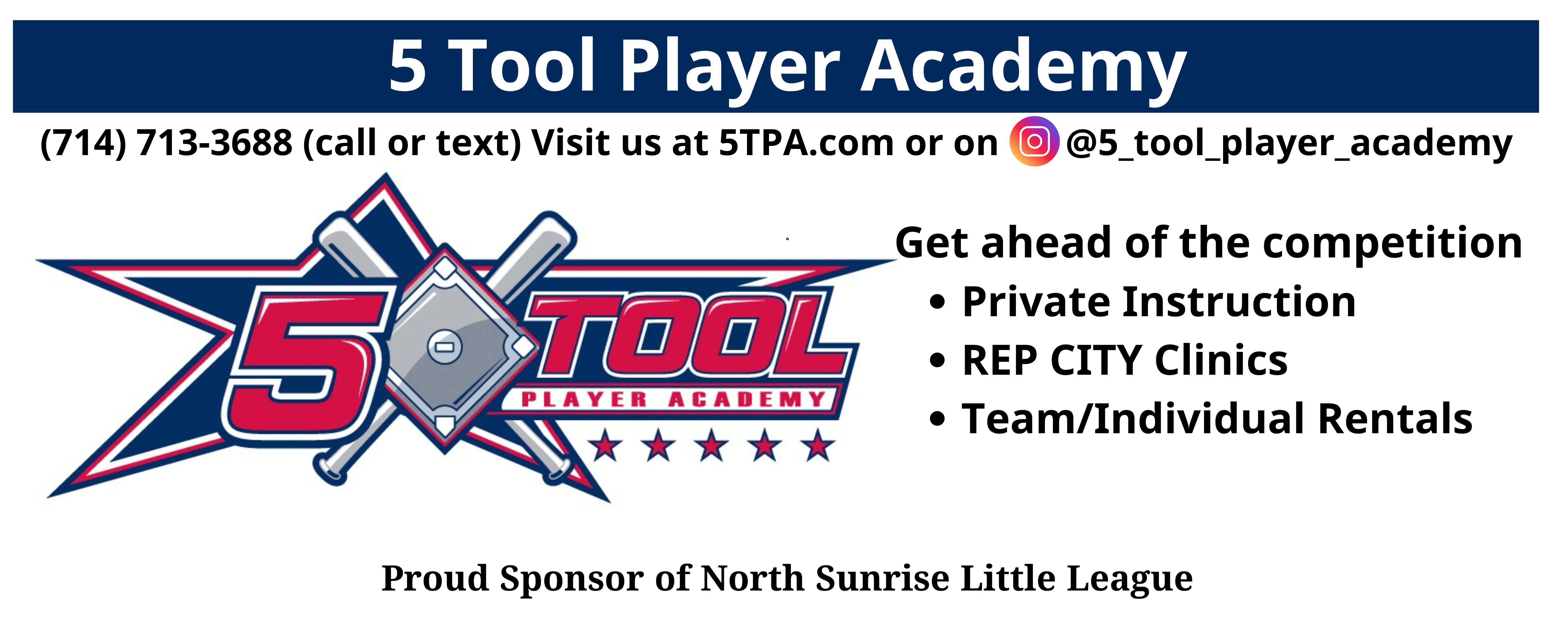 North Sunrise Little League provides 4 through 16 year old players a fun environment to stay active and create lasting memories.The support of local businesses and families allow NSLL to continue offering baseball's rich tradition to our young athletes. We're so grateful for what our sponsors just like you have helped us accomplish over the years. From funding our new batting cages to offering financial assistance to those in need, and so much more. We are immensely thankful to our past, present and future sponsors.THANK YOU 2026 SPONSORS